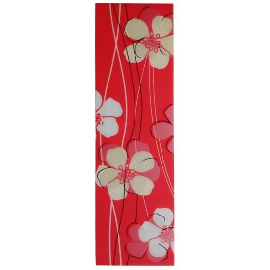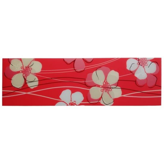 Această bordură decorativă Red 07767-101 este una dintre cele mai impactante. Are un design floral modern cu flori mari stilizate în nuanțe de alb, roz deschis și roz intens, cu detalii fine negre. Fondul este un roșu vibrant și uniform, iar liniile verticale subțiri albe adaugă mișcare și eleganță. Dimensiunea generoasă (13,5 cm lățime) face ca bordura să fie foarte vizibilă și să devină un accent puternic în amenajare.