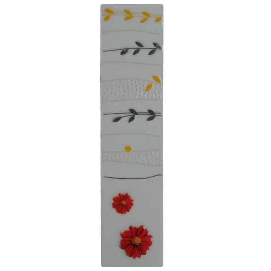 Această bordură decorativă AC2776 este o piesă elegantă și plină de viață. Pe un fond alb curat, designul prezintă două flori roșii vibrante cu centru galben, frunze galbene și gri în nuanțe naturale, ramuri fine și benzi decorative orizontale cu textură punctată și linii subtile. Totul este echilibrat și armonios, creând un efect floral ușor, modern și foarte plăcut.