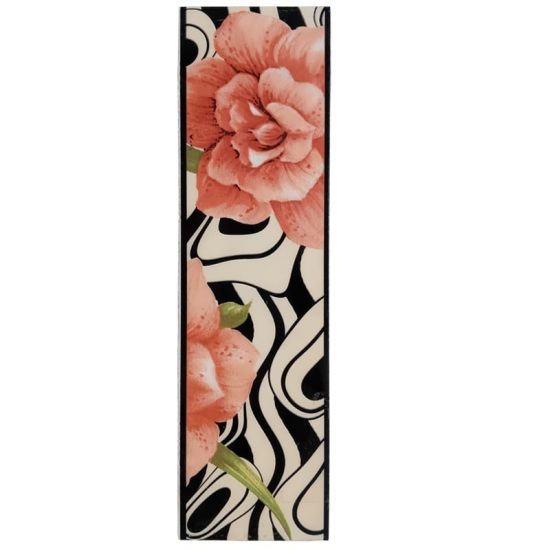 Această bordură decorativă Riviera Orange este una dintre cele mai spectaculoase și pline de viață. Pe un fond alb-crem cu valuri negre stilizate (efect marmură ondulată), se evidențiază două flori mari de portocal în nuanțe intense de coral-portocaliu, cu detalii fine și frunze verzi accentuate. Finisajul lucios face ca florile să pară aproape 3D și să prindă frumos lumina.