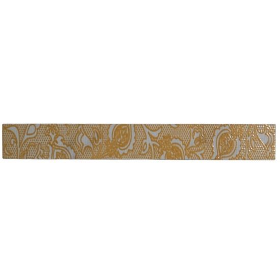 Designul este delicat și sofisticat: pe un fond alb curat se desfășoară un motiv floral continuu, bogat și simetric, în nuanță auriu-galben strălucitor. Modelul include flori stilizate, frunze, volute și elemente decorative cu textură punctată (aspect de dantelă fină), creând un contrast elegant între albul lucios și auriu. Aspectul general este luminos, clasic-modern și foarte prețios.