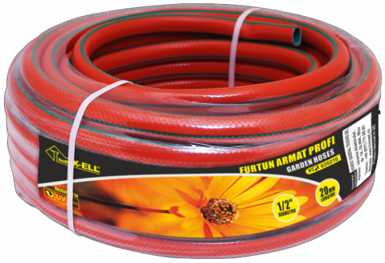 Furtun flexibil profesional armat, cu o durabilitate ridicata in timp Aplicatii: horticultura, agricultura Rezistent la actiunea algelor Rezistent la temperaturi scazute pana la -10°C Protectie UV Nu contine cadmiu sau plumb Lungime 20 sau 50 m Conexiune 1/2" sau 3/4" Presiune maxima 8 bar ( la 23°C)